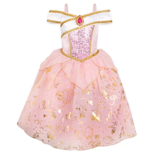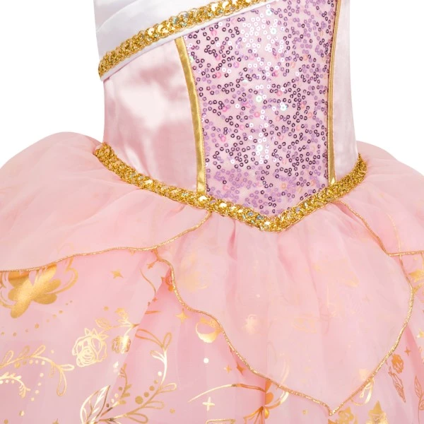 Faites vivre un rêve éveillé à votre merveille assoupie avec cette robe La Belle au Bois Dormant et ses filigranes et bordures dorés, son corset à sequins, ses multiples jupes, ses basques en organza et son col plissé orné d’un camée brillant.