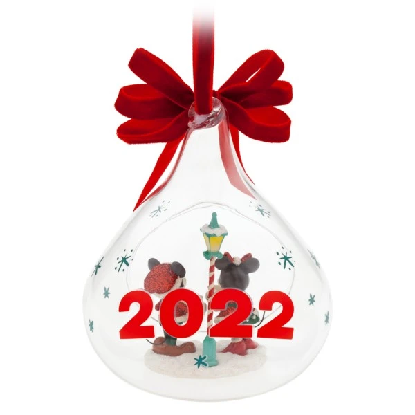 Votre couple préféré fredonne des chants de Noël à l’intérieur de cette décoration à suspendre Mickey et Minnie ! Ce globe en verre à suspendre est orné de l’inscription « 2022 ».