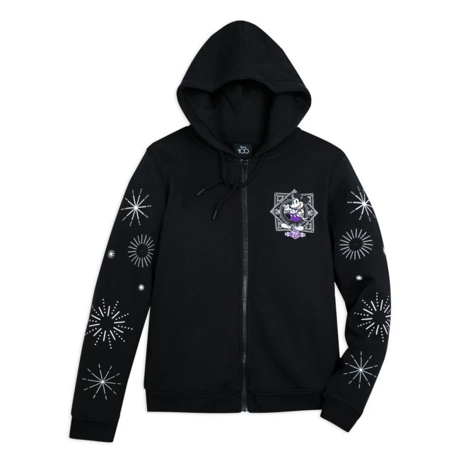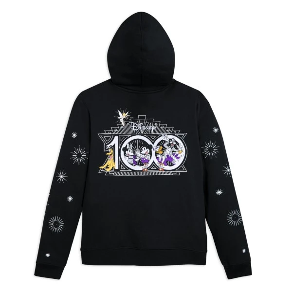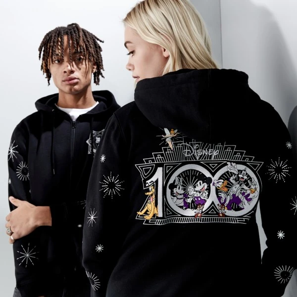 Mettez-vous sur votre 31 avec ce fabuleux sweat à capuche avec fermeture zippée à l’avant, issu de la collection Disney100 Celebration. Quoi de mieux pour faire la fête que ce modèle qui allie polaire douce et motifs à l’effigie de Mickey et ses amis ? Et c’est sans parler de ses imprimés métallisés et ses broderies à paillettes noires ! À l’arrière, Mickey, Minnie, Donald, Daisy, Dingo et Pluto sont tout sourire sous le logo « Disney100 ». À l’avant, Mickey porte une tenue élégante, et les manches sont décorées de feux d’artifice. Ce modèle fera une tenue parfaite pour participer à la fête du centenaire.