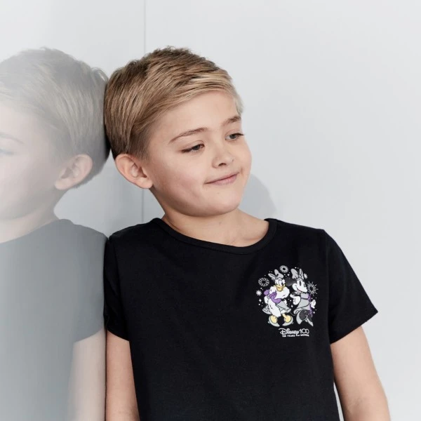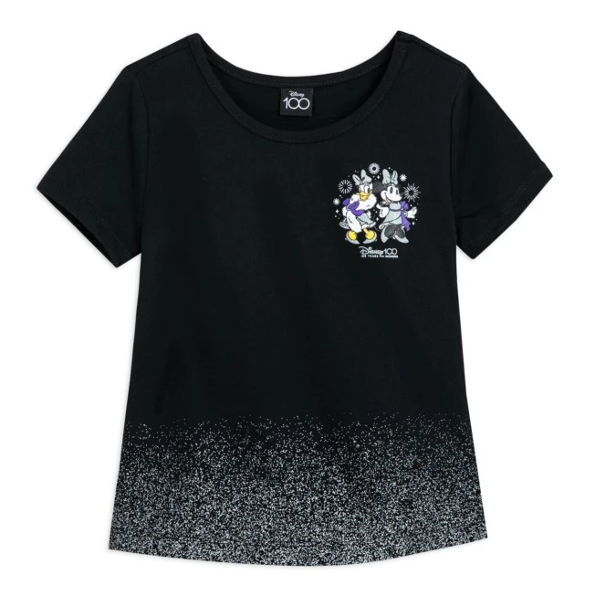 Sur ce t-shirt, Minnie et Daisy rayonnent à l’occasion du centenaire de Disney. Ce modèle comprend un tissu moucheté métallisé, un motif personnage à paillettes et les logos « Disney100 » et « Disneyland. »